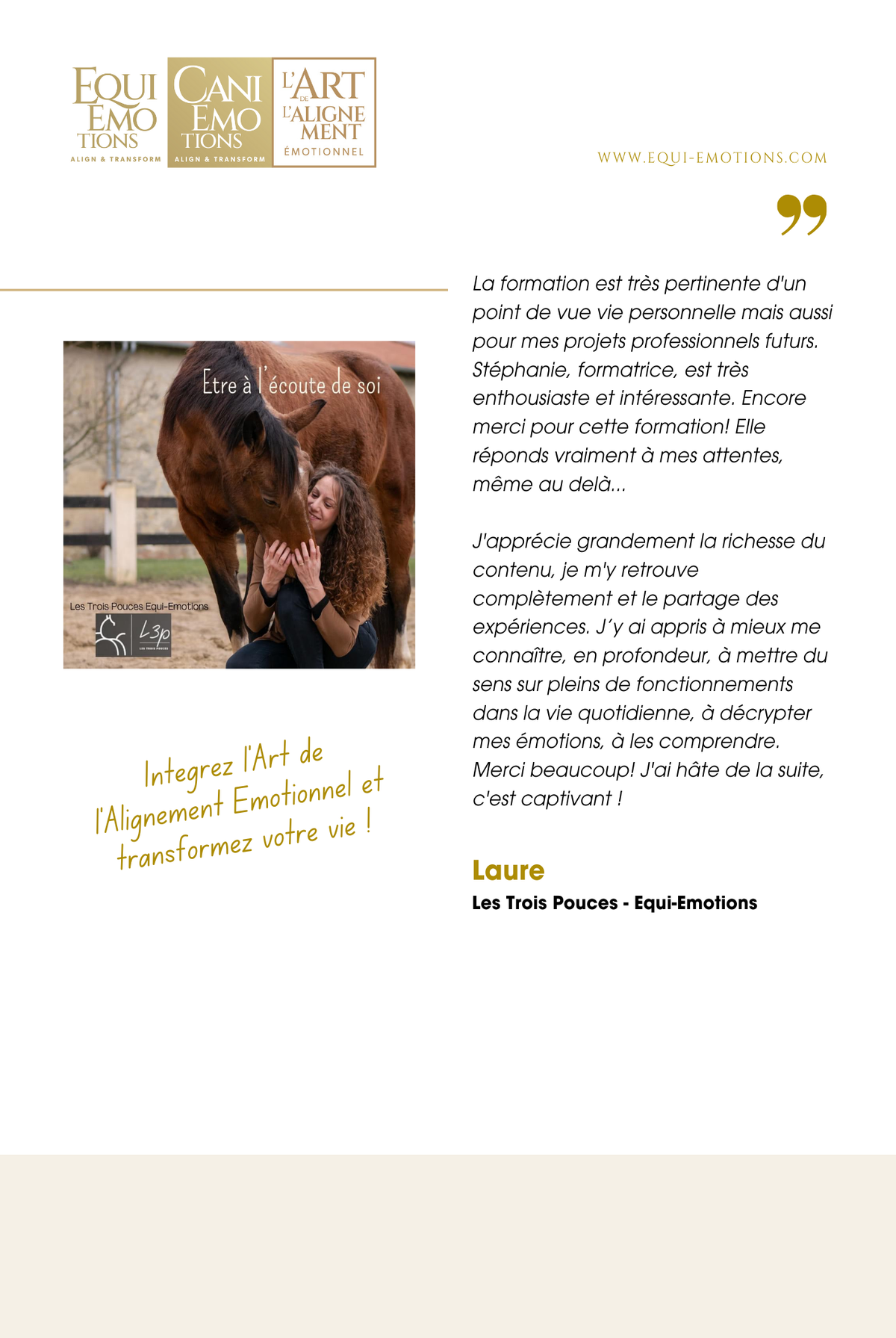 Les marques Equi-Emotions, Cani-Emotions et l'Art de l'Alignement Émotionnel sont déposées auprès de l'INPI afin de garantir une protection, une structuration et une promotion optimales de notre pratique. Vous avez la liberté d'exercer votre activité de manière indépendante, en y intégrant votre propre singularité pour vous démarquer.